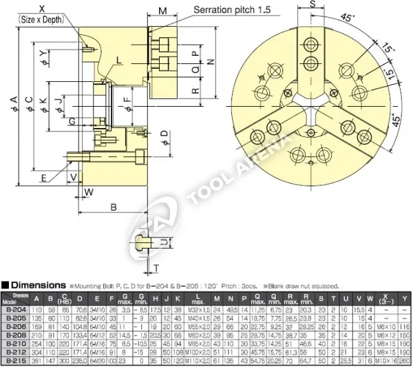 B-205 3х кулачковый высокоскоростной патрон с открытым центром Kitagawa