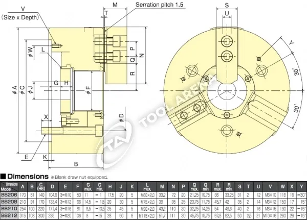 BB-208 3х кулачковый высокоскоростной патрон с открытым центром Kitagawa