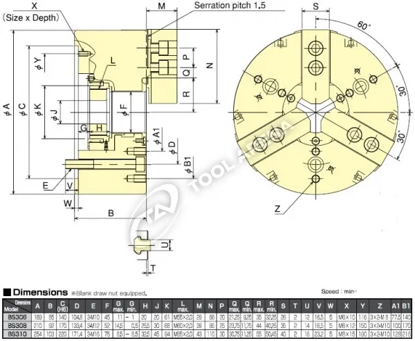BS-306A5 3х кулачковый высокоскоростной патрон с открытым центром Kitagawa
