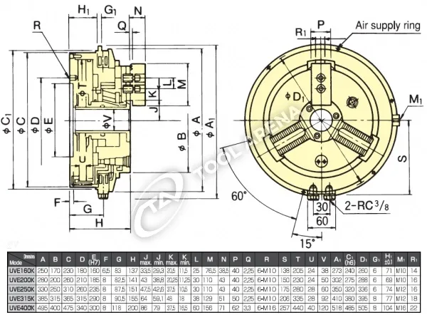 UVE-250K 3х кулачковый высокоскоростной патрон с открытым центром Kitagawa
